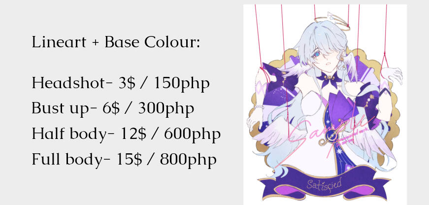 •Visual reference is required. It will be very helpful if you can provide even a simple stickman drawing to know the client's ideas^^ Especially when doing poses.•Be clear of Character details, again please provide visual reference if you can !•Art completion may take up to 1-3 days to 1-2 weeks, as it may depend on the style. Additionally, I may be busy with personal matters as well.